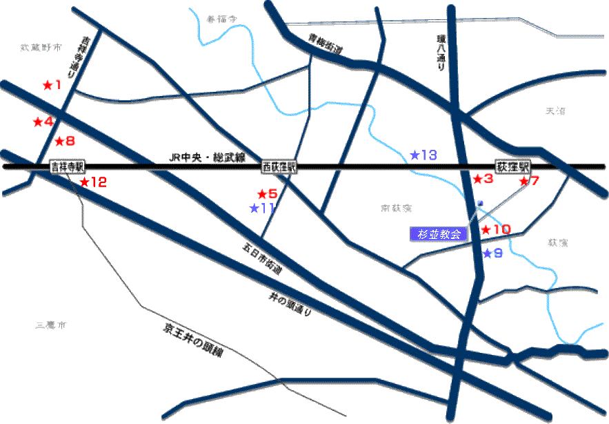 ■杉並教会への行き方を詳しく知りたい方は上記杉並教会へのアクセスをクリックしていただくか、地図内の杉並教会の部分をクリックしてください。
